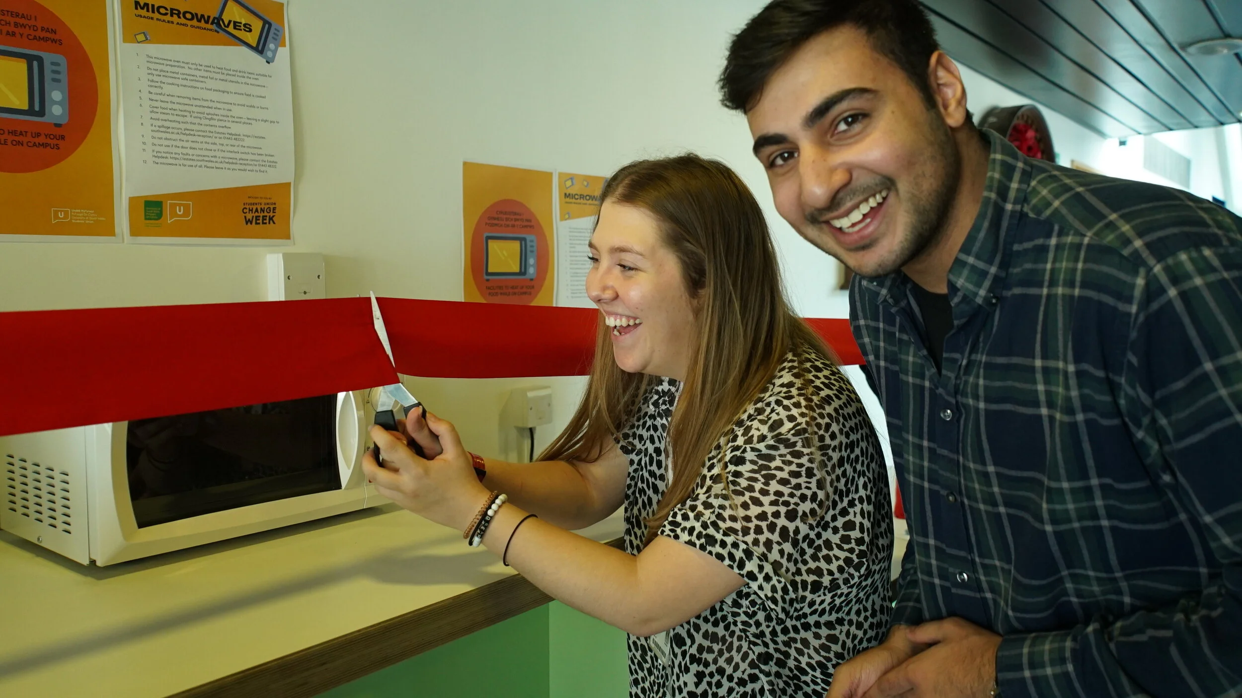 The first microwave was switched on at the Newport campus (Food Court, B Floor) during a Facebook Live broadcast by SU President Mish Wick and Welfare Officer Shannon Lee.